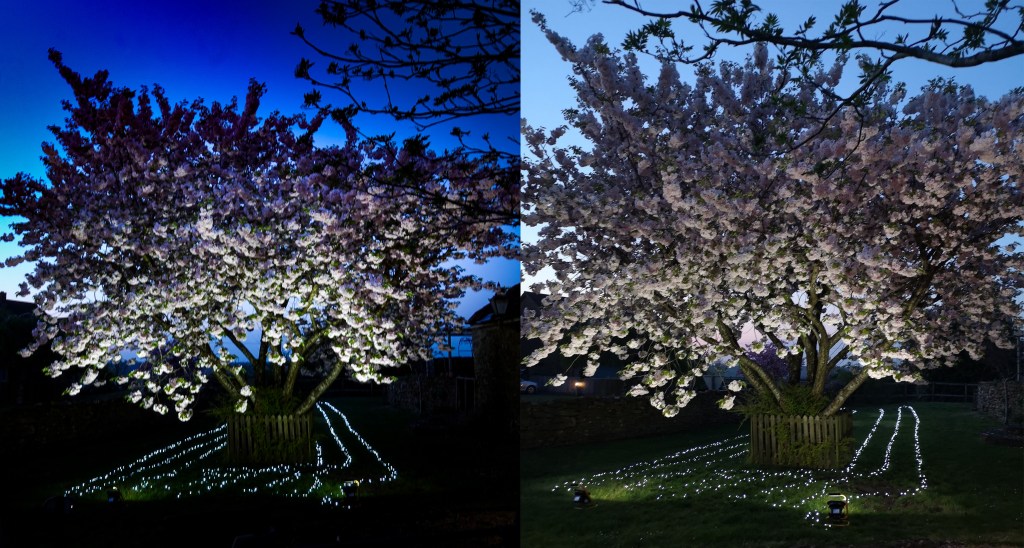 The 2 images in today’s post were taken last night in the pub’s garden. Our lovely neighbours set out some lights to see what could be created as the sun went down (whilst being cautious about social distancing rules)