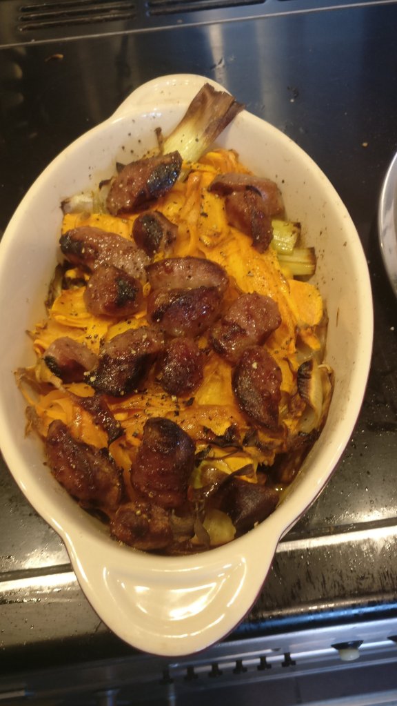 Anyway, I opted for the sausage and apple bake. We didn’t have any parsnips so I used carrots. We didn’t have any red onions so I used normal white and leaks.