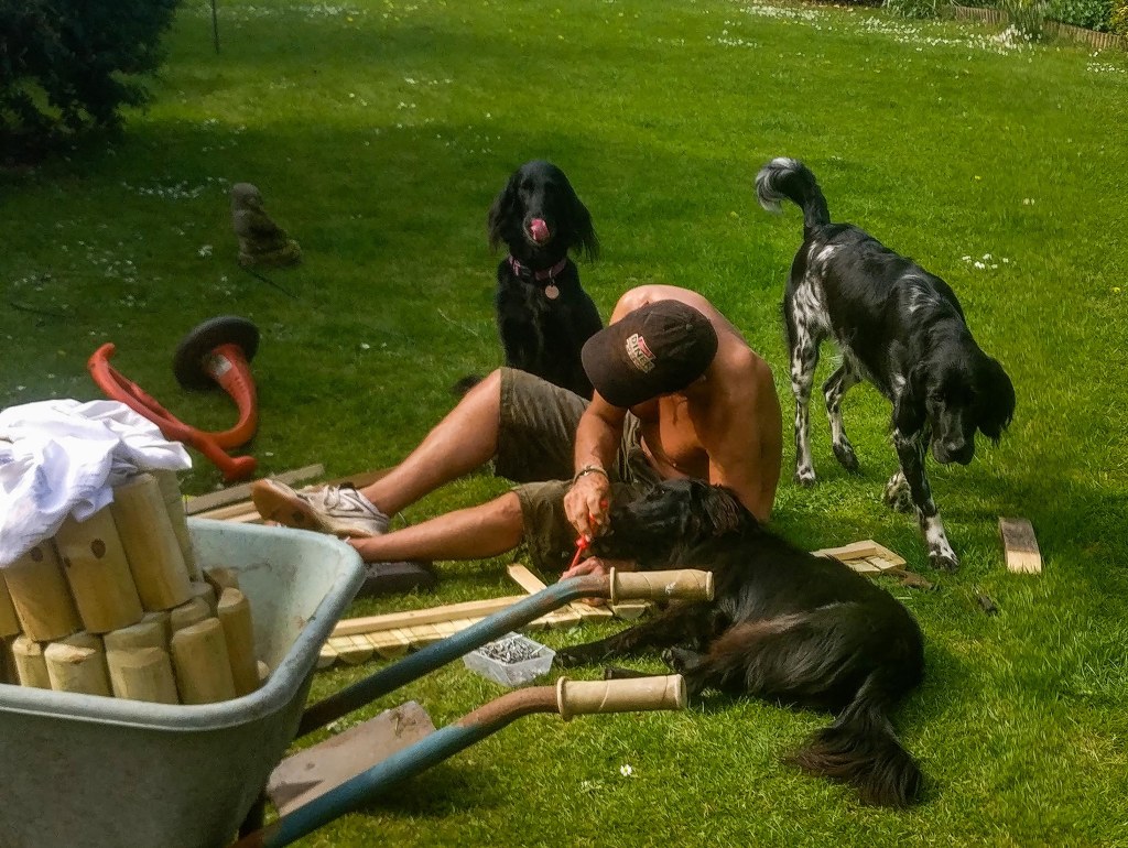 This ‘help’ consisted of stealing tools; sitting on me; checking the screwdriver whilst in use; removing sweat from my face with their tongues and chewing wood required for the job I was doing.
