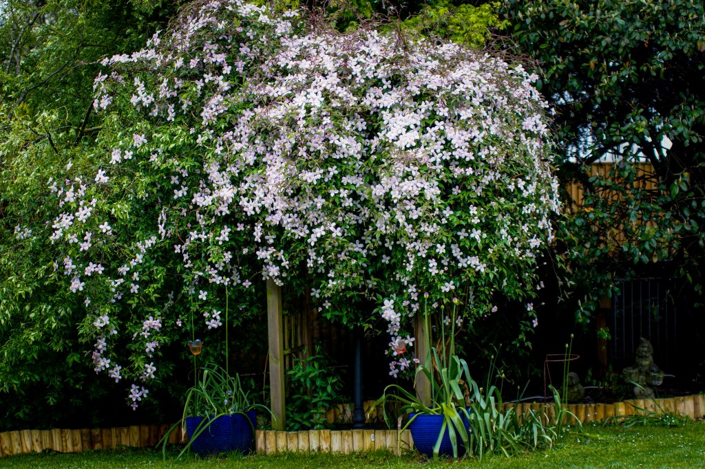 Well, today (in the UK) we had rain for the first time in ages. I took today’s picture between showers to cheer us up. Our clematis is looking lovely at the moment, despite the dreary weather.