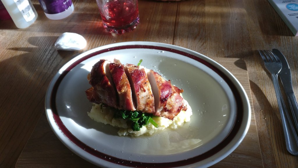 My turn to play in the kitchen again. Tonight’s meal was chicken breast, wrapped in panchetta, on a bed of spinach and garlic mash.