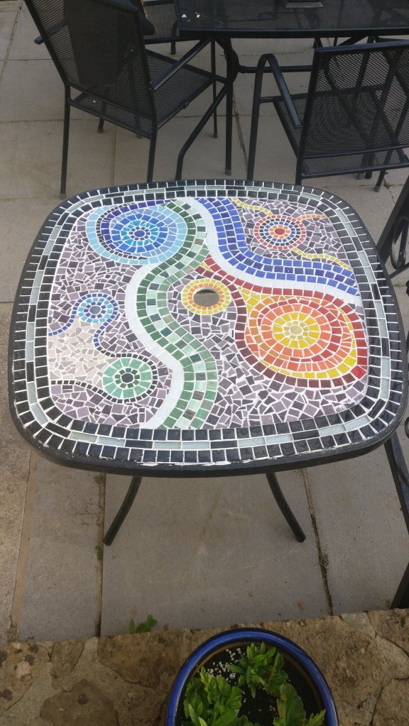 It’s finished…. Well nearly. We are waiting on our friends at Amazon to deliver a waterproof varnish, but the wife has done a great job transforming our rusty old garden table with a repaint and mosaic makeover.