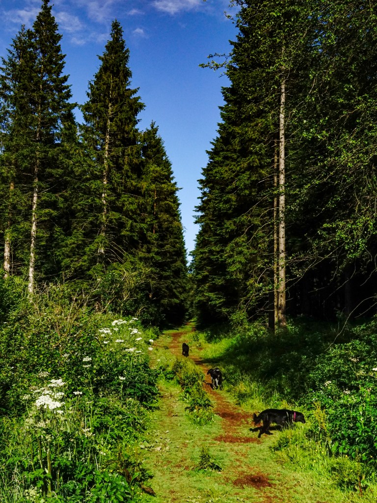 Today’s picture features our 4 legged children on a woodland walk. They love scurrying around, sniffing this and that, and we also get the benefit of being in a beautiful environment.