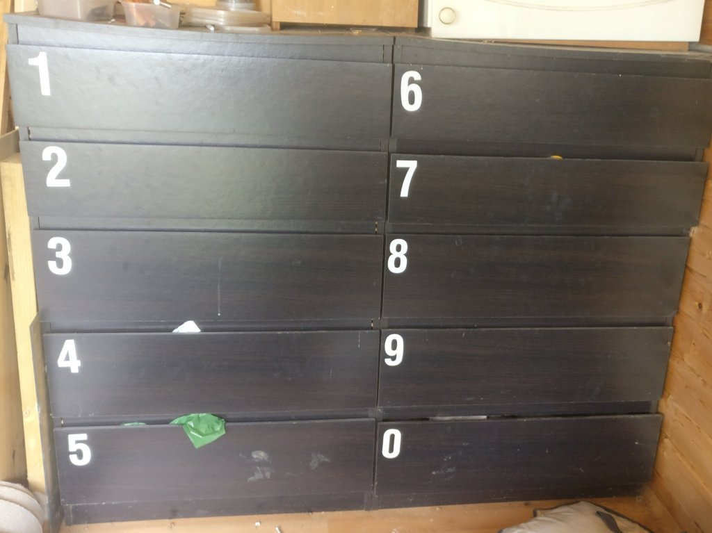 As you’ll see, there are numbers on each drawer in my workshop, and I have a white board detailing what they contain, for example, 4 contains plumbing stuff, 10 contains electrical stuff.