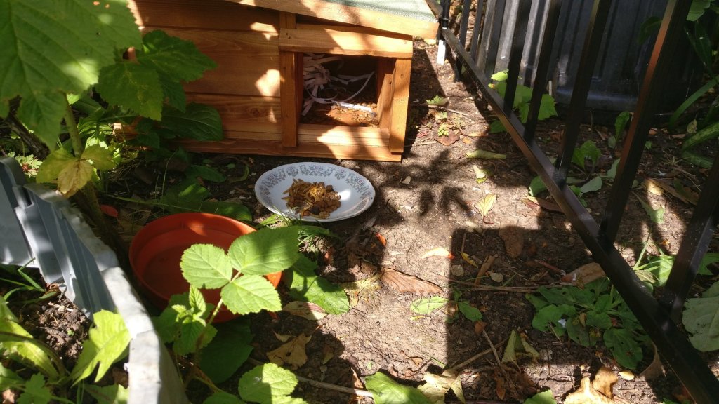 We positioned it in the fenced of fruit tree area, to ensure the 4 legged children don’t disturb it, with some hedgehog food, mealworms and water.