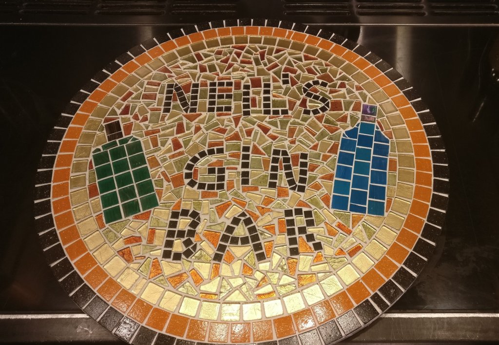 My lovely, talented wife, aided by her fab son made me a mosaic sign for the cabin, which has undergone a transformation from a workshop into a bar!!