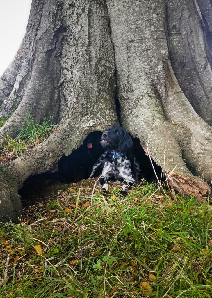 The hounds found a hollow in a huge tree to explore on our way yesterday. The hollow was very large, despite the tree still being alive