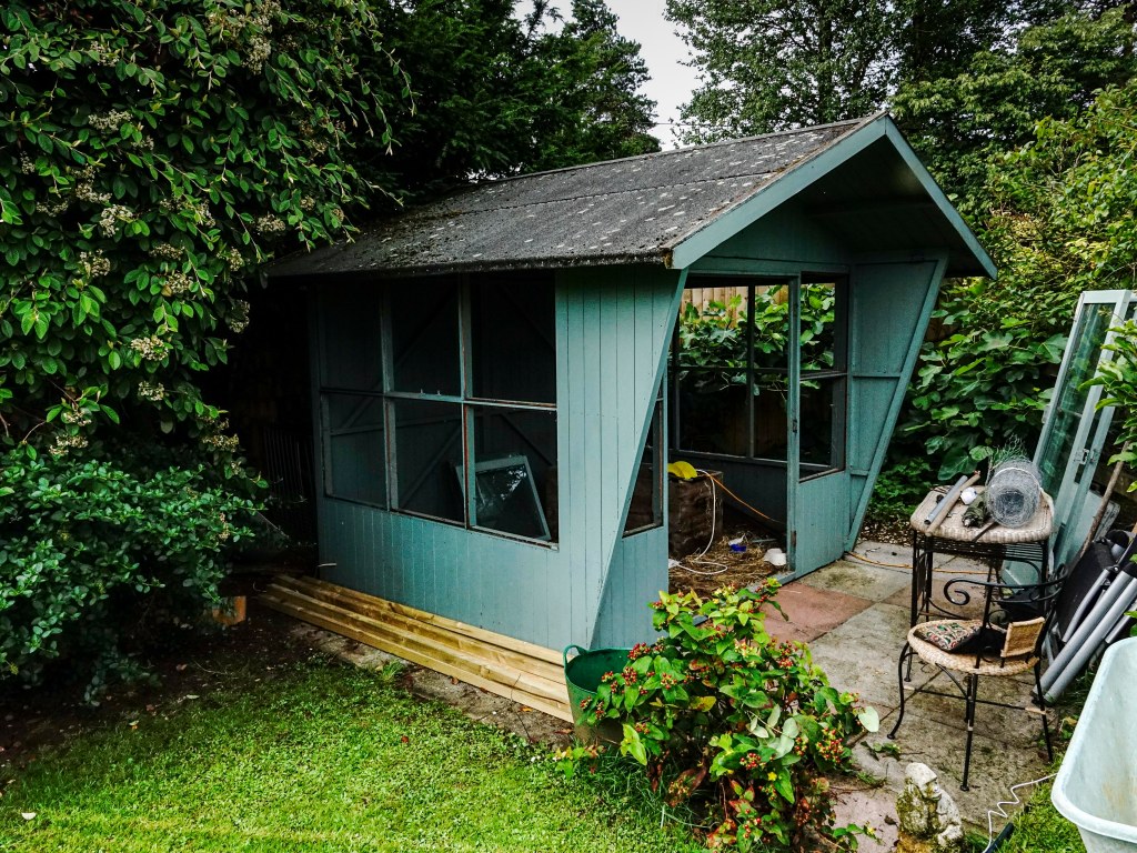 Today’s picture is of our summerhouse, minus glass and doors, just prior to demolition. It was here when we bought the house 16 years ago, and has lasted well, but has now started to rot, and rodents have also been munching it.